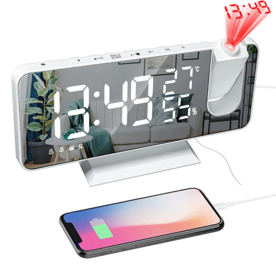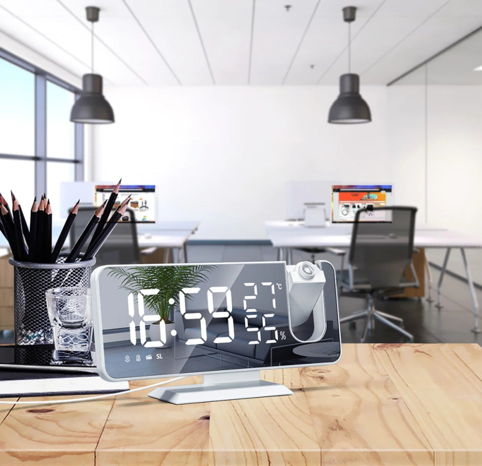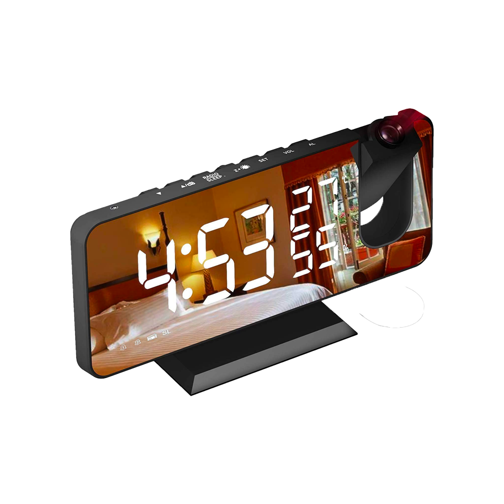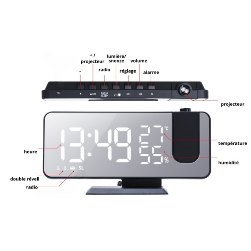 En effet, notre réveil projettera l'heure sur votre mur ou votre plafond en réglant l'angle de vue comme vous le souhaitez. Le projecteur peut être pivoté de 180° (de -90 ° à 90 °) et affichera l'heure jusqu'à une distance de 5m.