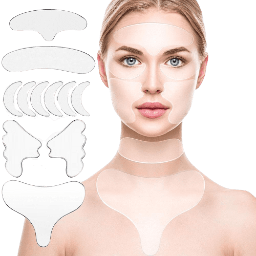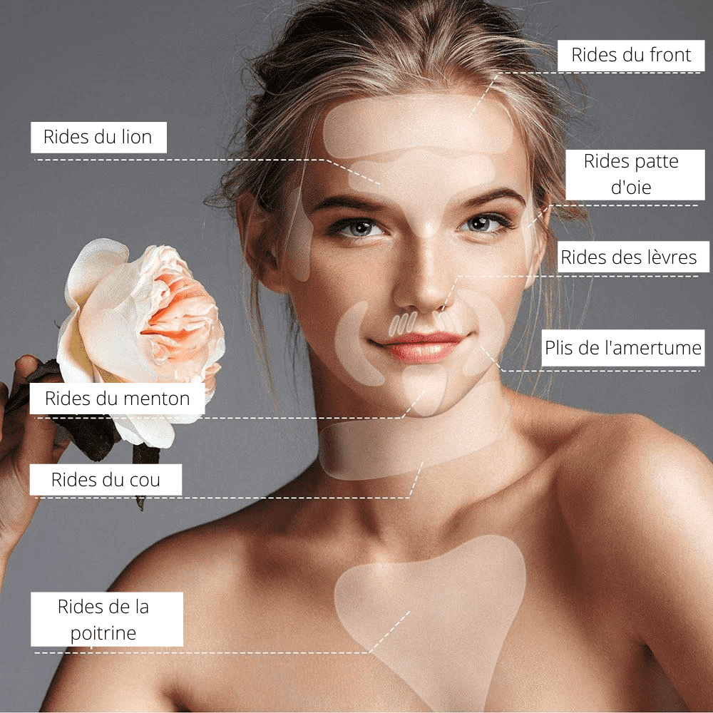 Dans ce kit, vous trouverez 11 patchs réutilisables anti-rides qui traiteront les rides de votre visage (front, yeux, joues, coins des lèvres...), de votre cou et de votre décolleté.